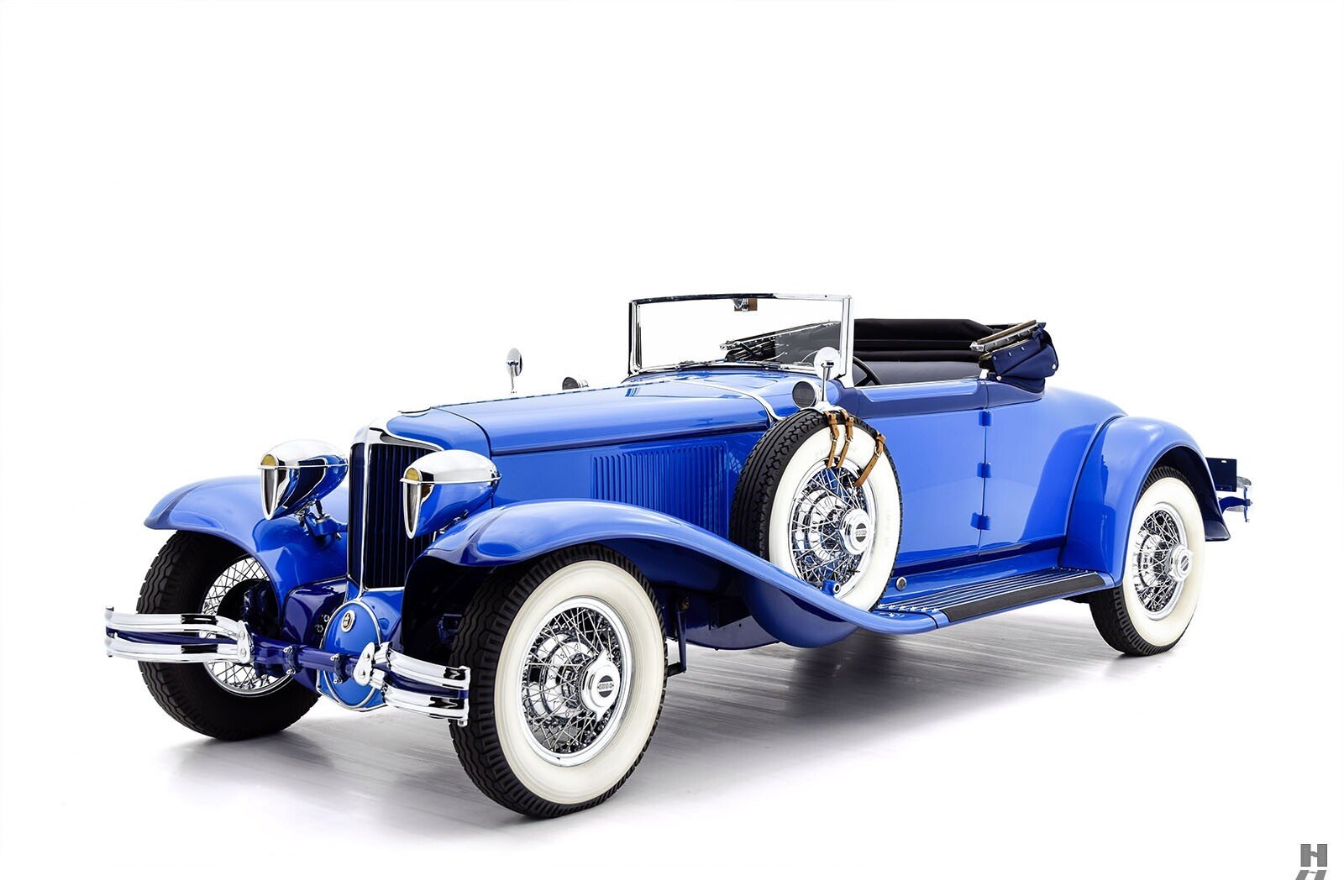 This stunning 1929 Cord L-29 wears sporty and stylish 2/4 passenger cabriolet coachwork, presented in an arresting two-tone blue livery. At just 58 inches tall, the Cabriolet stood a full 12 inches lower than its nearest competitor and was by far the most sporting body style in the Cord catalog. This example was meticulously restored in the 1990s and has since been refreshed and maintained in near-concours condition. This chassis was originally equipped with 5-passenger Brougham coachwork and is believed to have received this Cabriolet body at the time of its restoration. The presentation is truly exquisite, with its vivid blue main body accented with dark blue feature lines. Accessories include rare Woodlite headlamps, chrome wire wheels with dual side-mount spares, dual taillights, and a trunk rack. It comes to us from a significant collection of Classic Era automobiles and has been shown at several important events, including the Hilton Head Concours dElegance, and the 2017 Elegance at Hershey, where it received the coveted Peoples Choice trophy. One look and it is easy to see why this Cord continues to impress on the concours field. While the restoration has mellowed slightly, the quality of the paint remains exquisite. Fit and alignment of the body are excellent, and the chrome plating and brightwork are impeccable, from the gorgeous wire wheels to the intricately detailed door handles.