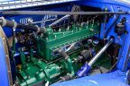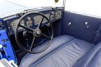 Complementing the dramatic color scheme is a two-place cockpit trimmed in navy blue leather, with subtle light blue piping. The drivers seat shows only minimal signs of use, while the matching blue leather rumble seat and door panels present in excellent condition. The distinctive dash features restored original instruments and control knobs in a proper textured-finish fascia. Even the screw heads are clocked in perfect alignment with one another, a testament to the level of detail given the restoration. A taut and attractive navy blue canvas roof rounds out the fabulous presentation.