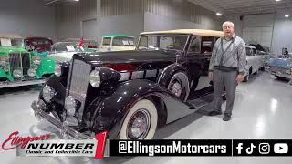 This 1937 Packard Super 8 Convertible Sedan is absolutely gorgeous example and was a previous national award winning Full Classic. By 1937, most of Packards American luxury automaker contemporaries, such as Duesenberg, Auburn, Cord, Pierce-Arrow, Peerless, Marmon, and Stutz, had succumbed to the poor economic conditions brought on by the Great Depression or would fail very soon. However, 1937 was a remarkable year for Packard! The luxury American automaker was seemingly on the up and up, after having a strong rebound from the economic effects of the Great Depression in the early half of the decade. Part of Packards rebound was thanks to Packards entry into the mid-level car market, which made the high-end Packards more affordable and thus attainable to the average consumer. Packards 1937 passenger car lineup was essentially divided into two categories, the Junior Packards consisting of the 115 and 120, and the Senior Packards consisting of the Super Eight and the Twelve. When the 1937 Super 8 was introduced in September 1936, they were loaded with technological and stylistic updates. One technological improvement in 1937 was the addition of Safe-T-Flex independent front suspension, which made for a smoother ride. Additionally, Packard introduced hydraulic drum brakes in 37 Fifteenth Series, which provided additional stopping power especially over the mechanical braking systems used in previous generations. Stylistically, the 15th Series Super Eight also sported newly redesigned front and rear bumpers, along with a new front grille and radiator that were now raked back 30 degrees. Packard also moved the front door hinges from the rear to the front, thereby removing the front suicide doors found in the previous two Packard series. In total, Packard produced a total of only 5,793 Super Eight models in 1937 which makes this particular Super 8 Convertible a very rare automobile. This particular 1937 Packard Super Eight underwent an extensive award-winning restoration winning National First Place Prize Awards in Antique Automobile Club of America (AACA), Classic Car Club of America (CCCA), and The Packard Clubs Packard Automobile Classic national competitions. Powering this 37 Super 8 is a 320 Cubic Inch Straight 8 cylinder engine fed by a single barrel carburetor that together were said to have created 135 horsepower when new. The 320 Inline 8 is mated to a 3 speed manual transmission that is shifted using a floor mounted shifter. Exhaust exits the L-Head Packard powerplant via single exhaust port that generates a nice throaty sound at idle or while cruising down the road. This 1937 Packard Convertible is nicely appointed with options. Equipped with dual covered sidemounted spare tires, each topped with a chrome outside mirror, this Packard Super 8 has a truly upscale, Pre-War look and squeezing in and out of tight parking spaces is also made much easier thanks to the chrome mirrors. At the nose, a pair of bumper guards adorn the front bumper further elevating the exterior appearance of this CCCA Full Classic. Mounted above the bumper guards are a pair of Trippe driving lights that improve visibility when taking this beautiful 1937 Packard Super 8 on a cruise at dusk or nighttime. Riding on a set of wide whitewall bias-ply tires mounted on painted steel wheels, each accented with beauty rings and a chrome Super 8 hubcap, this 37 Super Eight Convertible has an outstanding look. This 1937 Packard Super 8 also comes outfitted with a rear mounted luggage rack so that you can take all of your belongings with you on an overnight cruise or multi-day CCCA CARavan. The beige cloth convertible top is in excellent shape and it is raised and lowered manually. The exterior chrome and brightwork around the exterior of this 1937 Packard is in wonderful condition as well and further adds to the high level of restoration of this particular vehicle. The steel body has been refinished in beautiful Black paint and is accented with red pinstriping, completing the exterior look of the car. The interior of this 1937 Packard Super Eight Convertible Sedan is absolutely stunning! The front and rear bench seats have been reupholstered in beautiful Oxblood Red leather. A crank up glass divider window is in fantastic condition and it separates the front drivers compartment from the rear passengers cabin should one desire a little privacy. The rear passengers cabin also comes equipped with a pair of ashtrays, robe cord, courtesy light, and a folding center armrest. The red carpeting, matching door panels, burl grain dash, and woodgrain banjo-style steering wheel all appear to remain in their stock configuration and all present exceptionally well. The instrument cluster comes equipped with a 120 MPH speedometer, amp gauge, oil pressure gauge, temperature gauge, and fuel gauge, along with a clock and AM radio. Whether youre buying your first classic car or youre adding to an existing collection of CCCA Full Classics, this 1937 Packard Super Eight Convertible Sedan would make an excellent choice. Give Ellingsons a call today at 763-428-7337!