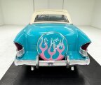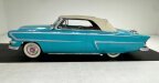 Not to be outdone by the exterior, a mixed use of aqua and white vinyl covers all the door panel surfaces and seats. The seats are in white vinyl with tuck and roll inserts with aqua piping, and we note a large front split back bench in front and a solid bench in the rear. The original steering wheel has been retained and in the center is the Ford crest badging. The steering wheel is black bakelite with a few notable cracks. Upfront is the original dash with an arched speedometer with various gauges arching above it within the aqua steel dash top. Shiny chrome bezels throughout house black topped knobs and the factory AM radio remains in its original location. On top of the dash in a center pod is the factory clock and beautiful black carpet floods the floors and floats all this 50s splendor and excess.