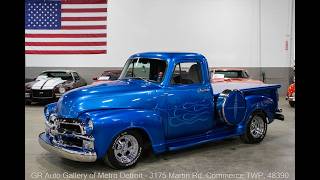 GR Auto Gallery is pleased to present this stunning 1954 Chevrolet 3100 Pickup for your consideration. Finished in an eye-catching Stratus Blue Metallic over a clean Gray interior, this meticulously built truck has logged just 16,463 miles since undergoing a complete frame-off restoration. Powering this classic pickup is a massive 454 cubic inch V8 paired with a Turbo 400 automatic transmission and a durable Ford 9-inch rear end. Performance and drivability upgrades include a Mustang II rack and pinion front suspension, Wildwood front disc brakes, Holley Sniper EFI, and a 120 amp alternator. Comfort and convenience features abound with ice cold air conditioning, Dakota Digital gauges, a Grant wood steering wheel, Kenwood speakers, and a Stinger touch screen stereo with a back-up camera. This 3100 rides on classic Cragar wheels and also features under glow lights with a switch, exhaust cut-outs with an electric switch, a beautifully stained wood-finished bed with a tonneau cover, chrome front and rear bumpers, and much more. This truck has been featured in numerous magazines and comes with tons of receipts and documentation, reflecting the level of care and craftsmanship invested in the build. Drive this one out of our showroom or have us assist with shipping it to you anywhere in the United States! Dont hesitate to call us with any questions or for more information.