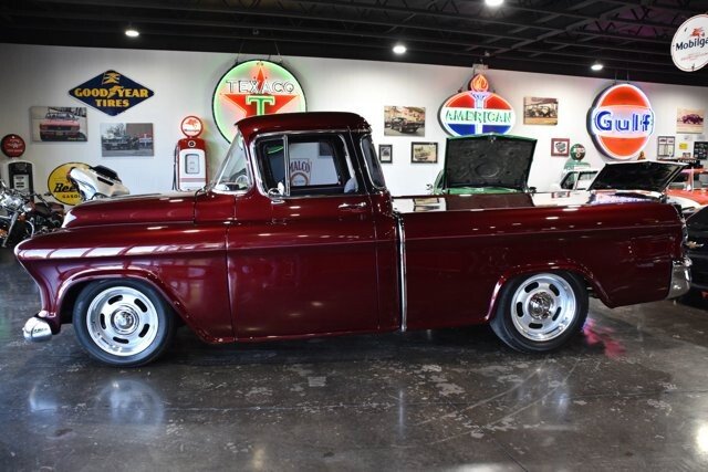 Super nicely built 1955 Chevrolet Cameo, running a 454 CID V8 under the hood with a Monster aluminum radiator, power steering, power brakes and a Turbo-Hydramatic 400 3 speed automatic transmission. Sitting on 1-piece 18 inch steel wheels and Falken Ziex ZE950 255/55/18s. Sporting an updated 2 tone black and gray interior with a upgraded instrument cluster and Vintage Air A/C. Finished in a show quality dark red paint, fresh wood bed and a hydraulic tonneau cover!