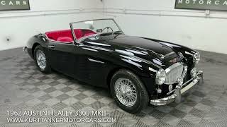 1962 AUSTIN-HEALEY 3000 MK2 BT-7. TRIPLE CARB. BLACK WITH RED LEATHER TRIM. BLACK CLOTH TOP, BLACK VINYL TONNEAU COVER. 4-SPEED WITH OVERDRIVE GEARBOX. 60-SPOKE CHROME WIRE WHEELS. HIGH QUALITY, PHOTO DOCUMENTED, GROUND-UP RESTORATION CIRCA 2015. EXCELLENT. 77,371 MILES.