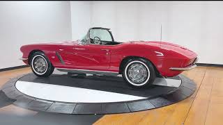 Roman Red over a Black interior with a Black Canvas Convertible Top and an Auxiliary Hardtop. Casting Number 3782870 RE Suffix Block. Numbers Matching 327 340 HP Paired to a 4 Speed Manual Transmission. Features Include Auxiliary Hardtop, Wonderbar Radio, Courtesy Light, Reverse Lockout Shifter, Ignition Shielding, Windshield Washer Bottle, T3 Headlamps, Harrison Radiator and Overflow, Stainless Wheel Covers with Whitewall Tires and more! This is a Gorgeous 1962 Corvette! Beautiful Cosmetics with Excellent Stainless and Chrome! Talk about a head turner! Both TOPS!! Nice Tight Driver that is a lot of fun out on the road with a 340 HP and a 4 Speed!! The most iconic Color on a Solid axle, Roman Red!! Please give us a call today for more detailed information! We would love to hear from you!