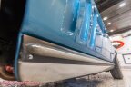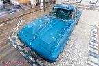 Next, we will look at the interior of this 65 Coupe. On the inside, its also done in the factory blue color scheme. Both door panels are in excellent condition, along with all the carpet, front and rear. The bucket seats are beautiful as well, and all the padding is in excellent condition. Looking at the dash, we can see it has the woodgrain wheel. All the factory gauges are excellent as well and working as they should. The center console houses the four-speed shifter. We can see the headliner has a great fit and that the visors are very nice as well.