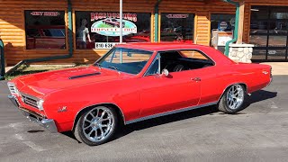 Under the hood the original motor has been replaced with a 69 396, 375 horse, Edelbrock aluminum intake and 4 barrel carb with electric choke, nicely updated with electronic ignition, Vintage AC and heat, chrome valve covers and breather, updated with 100 amp 1 wire alternator, direct-fit aluminum radiator with dual electric fans from Derale Performance, power steering, nicely updated with power 4 wheel disc brakes, drilled and slotted rotors, updated with Ridetech lowering coils all around, 1 1/4 front sway bar, set of long tube headers into dual Flowmaster exhaust out the back in stock location, this strong running 396 is backed up with a 350 turbo trans, 10 bolt limited slip rear, also has been updated with rear sway bar.
