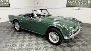1967 TRIUMPH TR4A IRS CONVERTIBLE. TRIUMPH RACING GREEN WITH BLACK TRIM AND BOOT, CREAM TOP. 4-SPEED, 60-SPOKE WIRE WHEELS. MICHELIN ZXs. PERIOD WOOD/ALLOY STEERING WHEEL. BULLET MIRRORS. LOVELY RESTORED CAR IN PERFECT COLORS. 87,239 MILES.