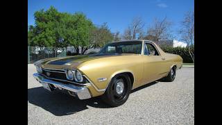 Check out this great looking real SS El Camino finished in a Copper Metallic paint with Black Stripes sitting low with a set of Black painted 17 inch American Racing Aluminum Rally wheels with some low profile tires to give it a bad boy appearance! Under the hood sits a period correct 396 V8 engine with an Edelbrock Performer intake manifold, Edelbrock 4 barrel carburetor, HEI ignition, polished Aluminum valve covers, upgraded Chrome 1 wire alternator, Aluminum radiator and dual exhaust with performance mufflers headed all the way out back for a nice deep Big Block rumble. Power gets put to the road through a 3 speed Automatic Turbo 400 transmission backed by a 12 Bolt rear differential. The interior is mostly stock with a Black vinyl bench seat, factory gauges and tachometer, custom 3 spoke steering wheel with tilt steering column and custom classic style stereo. Definitely a cool Classic Muscle car that will carry your toys in the back!