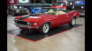 This 1969 Ford Mustang Convertible delivers classic open-air cruising with V8 performance. Powered by a 351 Windsor Ford V8 paired to a C4 automatic transmission and 9-inch rear end with 2.79 gears, it offers smooth, effortless driving. Air conditioning, power steering, power brakes, and a power convertible top enhance comfort and convenience. The white vinyl interior contrasts beautifully with the red exterior and black stripes. Polished American Racing Torq Thrust wheels and staggered Sumitomo tires complete the stance. An Edelbrock Performer intake and Holley four-barrel carburetor provide reliable performance, making this Mustang a timeless American icon ready to enjoy. THIS VEHICLE QUALIFIES FOR FREE SHIPPING AND A WARRANTY!!