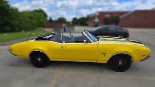 This 1969 Oldsmobile Cutlass S Convertible is described as a true old-school classic with modern attitude, finished in bold yellow with black racing stripes and matching custom rims. Power comes from a strong 350 Rocket V8 paired with custom headers and an automatic transmission with a floor shifter, and it is noted to run great and sound even better. The car is described as solid and straight, but not perfect, with a few small rust spots and it still needs some finishing touches. Overall, its presented as a great candidate for the next phase of restoration or customization while offering that classic muscle car feel in a drop-top package.