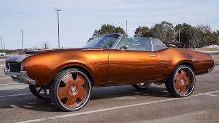1969 Oldsmobile Cutlass S Convertible 6.0L Naturally Aspirated LS V8 Electronic Fuel Injection Automatic Transmission RWD Candy Rootbeer Brown Exterior Tan Interior Brown Convertible Soft Top Aftermarket Intake System Aftermarket Ignition Components Aftermarket Audio System Aftermarket Pioneer Touchscreen Head Unit Aftermarket Center Console Reupholstered Interior Aftermarket Steering Wheel B&M Quicksilver Shifter Oversized Asanti Multi-Piece Wheels Custom Paint Job