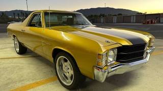 This 1971 Chevrolet El Camino is described as a great running and driving classic thats ready to go in daily-driver condition. It is reported to be a rust free California car with a clean title and registration up to date. The exterior is shown in a Metallic Gold finish with black hood stripes, giving it a standout appearance, and the bed area presents clean and well-finished. The interior is shown in a Black/Yellow cabin with Yellow accents on the seating surfaces. Powered by a V8 350 and a TH 350 automatic transmission, it also features power steering, power brakes, an Edelbrock carburetor, and MSD ignition.
