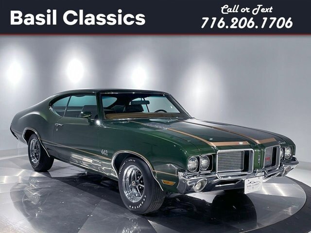 Another addition to the Basil classics showroom is our numbers-matching 1972 Oldsmobile 442! This 442 has only one factory-applied paint job: Sequoia Green with Saddle Tan striping! The paint on this 442 is one not often seen, making this 442 stand out. This car underwent a complete restoration previously, making it a great example. All body lines and panels on the car are straight and show no signs of misalignment or accidents. All chrome on this 442 is in excellent condition, showing no signs of pitting or corrosion all around the vehicle. This 442 is optioned with Olds W-29 package. Coded W29, the 442 Appearance and Handling Package for 1972 consisted of hood, bodyside, and decklid striping; hood louvers; 442 grilles and emblems; wheel-opening moldings; FE2 Rallye Suspension (with heavy-duty front and rear coil springs and shocks, front/rear anti-roll bars, boxed lower rear control arms, and wider 14 x 7 wheels); and a Hurst floor-shifter for the three-speed manual transmission. Also, available with any motor. This old car is also equipped with a numbers-matching Rocket 455ci V8, an available motor option for that year. This 455 is equipped with a Rochester 4-barrel carburetor painted in a period-correct light blue color. Mated to the 455ci motor is also a numbers-matching Muncie 4-Speed manual transmission! The interior of this 442 is finished in Olds dark saddle tan leather interior with tan carpets. The dash is equipped with all factory gauges, an AM/FM radio, a clock, and even A/C! The interior shows no tears, stains, stretches, or any blemishes! The trunk of the 442 still has its original trunk lid stickers! Included with the car are factory body-color-matched wheels. This truly is a fantastic example of what a 442 should be! Come in and see it today at Basil Classics!