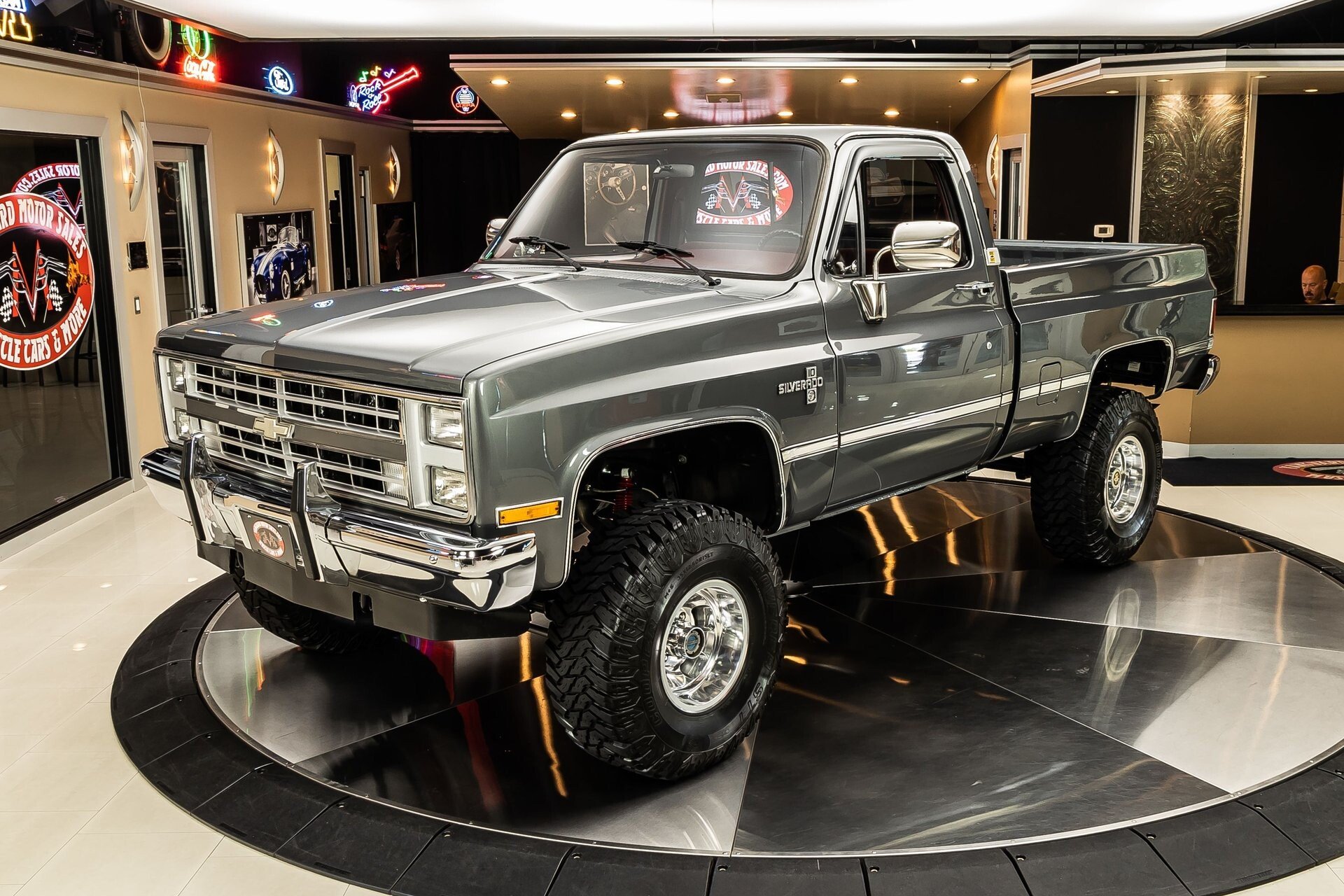 Check out this amazing 1987 Chevrolet Silverado 4X4 Pickup! This Silverado is sporting gray metallic paint with polished trim, & grey bedliner, 15'' US Mag polished aluminum wheels with 35x12.5R15 Cooper STT tires, dual headlights, chrome bumpers, and polished exhaust tips! Inside, this '87 is fitted with a red interior with brushed aluminum trim, bench seating, shoulder seat belts, power windows, stock gauges, an aftermarket radio, and carpeted floor mats.