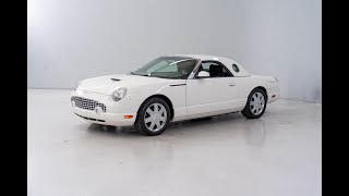 This 2-owner, totally original 2002 Thunderbird roadster is a beautiful example of a modern luxury sports car. The exterior is finished in Whisper White and accented by 17 factory polished spoke alloys that mount Cooper premium radials. The black leather interior is in very good condition. The Thunderbird has two tops a removable fiberglass hardtop and a power assisted soft-top. Convenience/safety features include dual front/side airbags, climate-controlled A/C, power tinted windows, tilt/telescopic wheel and power locks. Additional features add 6-way power driver seat/2-way power passenger seat, power locks, keyless entry, cruise, anti-theft and a premium AM/FM/CD sound system w/6-disc changer.