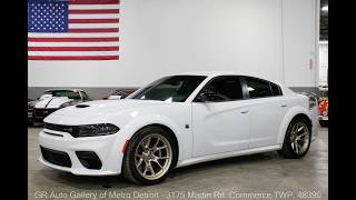 GR Auto Gallery is pleased to present this 2023 Dodge Charger Scat Pack Swinger for your consideration. Finished in striking White Knuckle exterior over a Black interior, this widebody Charger shows just 377 miles and has had one owner since new. It has been garage-kept, never seen rain or snow, and remains completely bone stock. Power comes from the legendary 6.4L HEMI V8 producing 485 horsepower, paired with the 8-speed automatic 8HP70 transmission and a 3.09 rear axle ratio. As part of Dodges Last Call lineup, only 1,000 Swinger models were produced for 2023, making this example a true modern collectible. It rides on gold school wheels and features Brembo 6-piston front calipers, adaptive damping suspension, a performance shift indicator, flat bottom steering wheel, and the exclusive Swinger instrument panel badge. Additional features include push-button start, remote start, power locks, power mirrors with memory and heat, blind spot indicator, rear park assist, heated and ventilated front seats, automatic high beams, navigation GPS, and much more. Drive this one out of our showroom or have us assist with shipping it to you anywhere in the United States! Dont hesitate to call us with any questions or for more information.